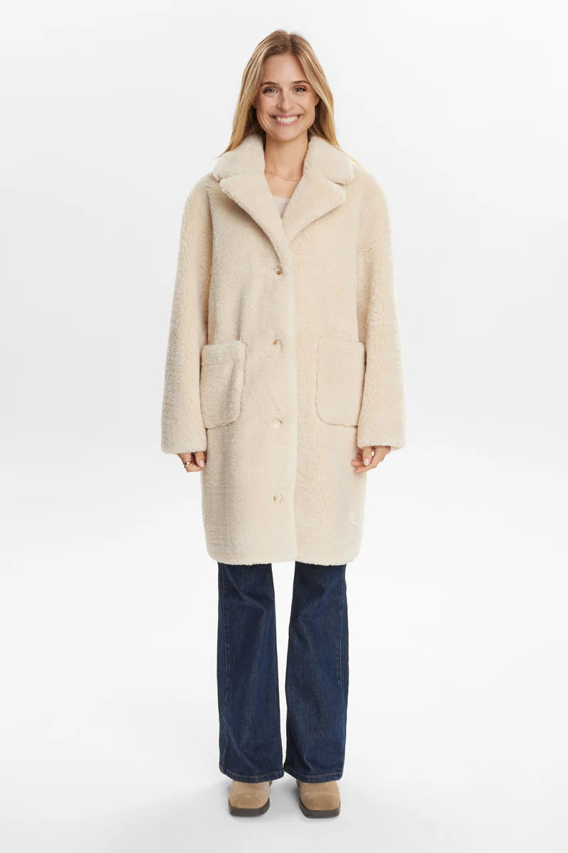 Un abrigo que abraza dos estilos en una sola prenda: la calidez envolvente del borreguito y la elegancia atemporal del ante suave.