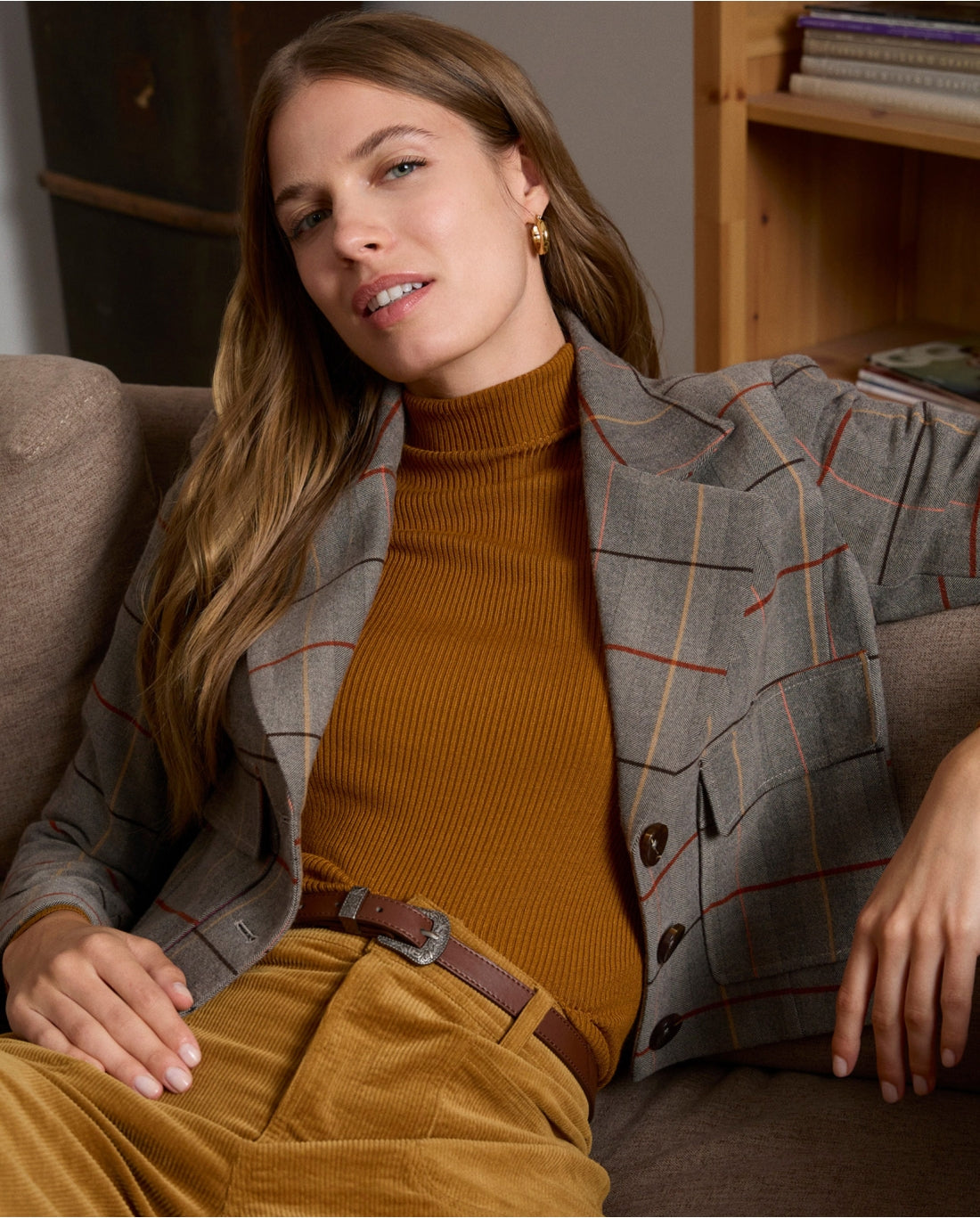 Americana corta con estampado de cuadros y estilo escocés. Presenta un diseño estructurado, bolsillos delanteros con solapa y cierre con grandes botones. Corte entallado y moderno, ideal para looks de oficina con un toque original. El tejido mezcla poliéster y rayón, con un punto de elastano para mayor comodidad.