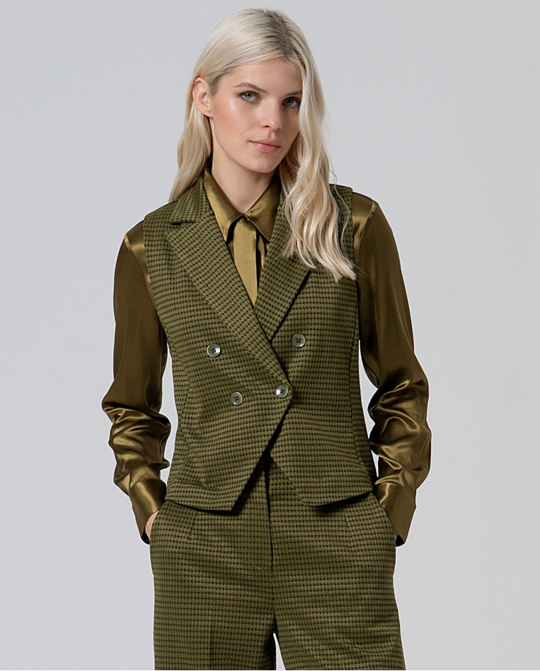 Su patrón pata de gallo en tono verde oliva aporta profundidad y sofisticación, mientras que su corte cruzado define la figura con elegancia precisa.
