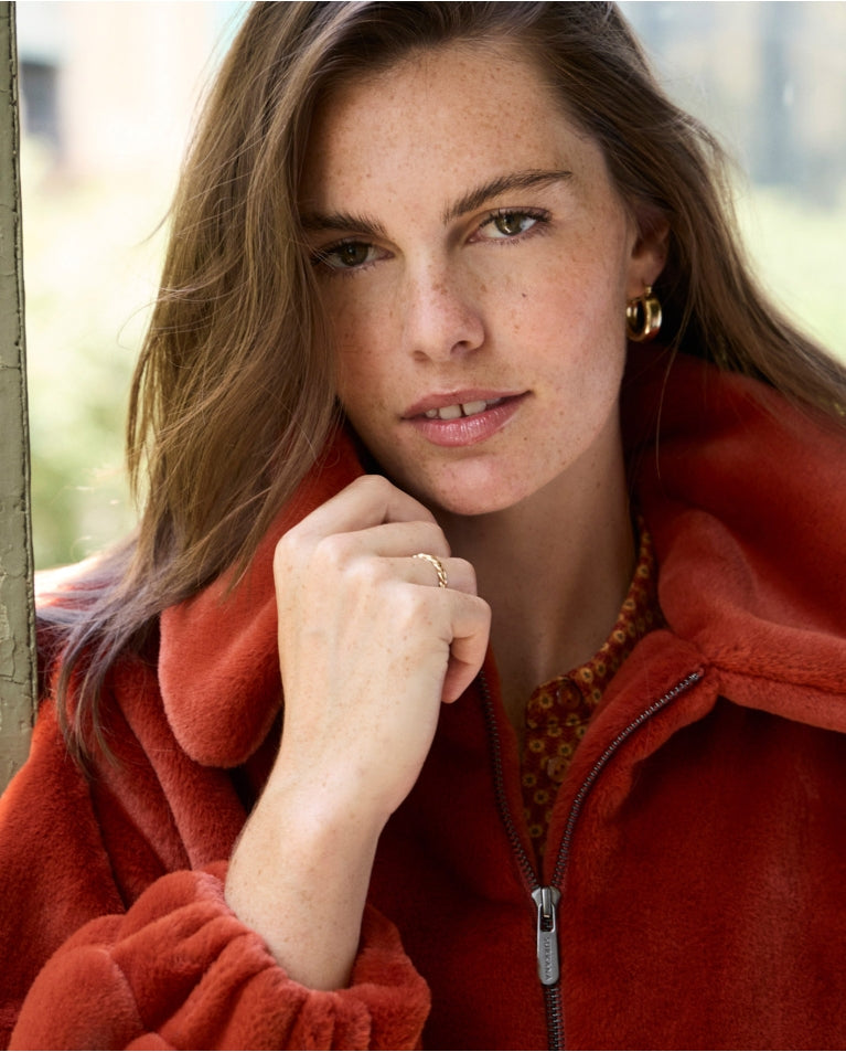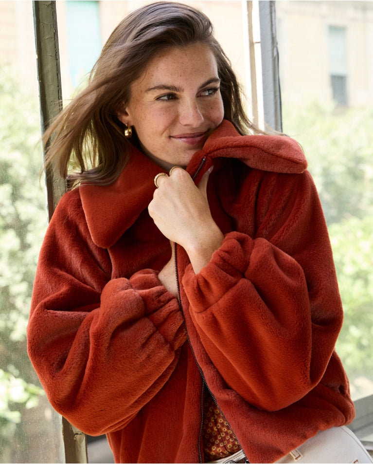 Esta chaqueta bomber en tono teja intenso combina elegancia y confort con un toque contemporáneo.