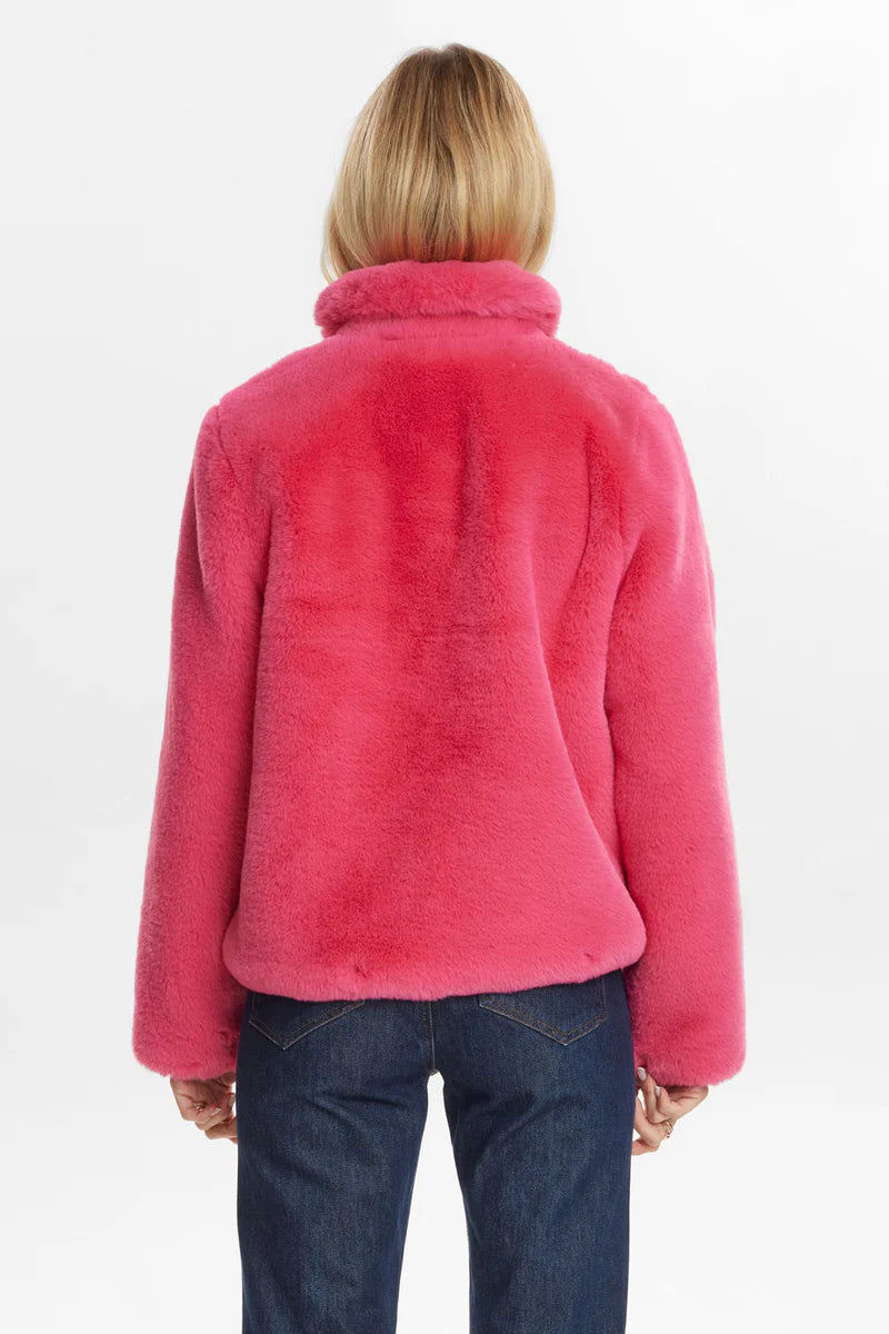 El cuello alto estructurado y los cierres discretos realzan su silueta limpia, mientras el tono fucsia aporta una energía contemporánea y elegante.