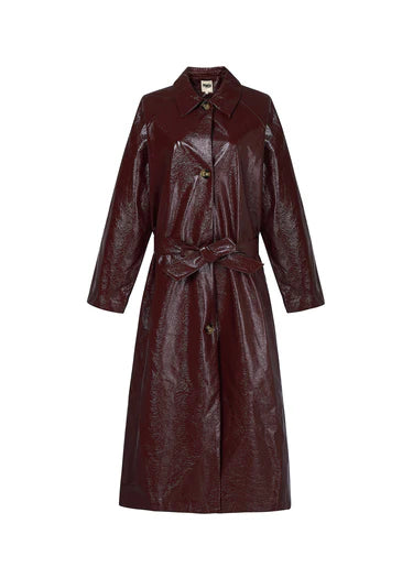 Esta gabardina reinterpreta el diseño clásico con un acabado de vinilo brillante en un profundo tono Borgoña, ofreciendo una declaración de sofisticación audaz.