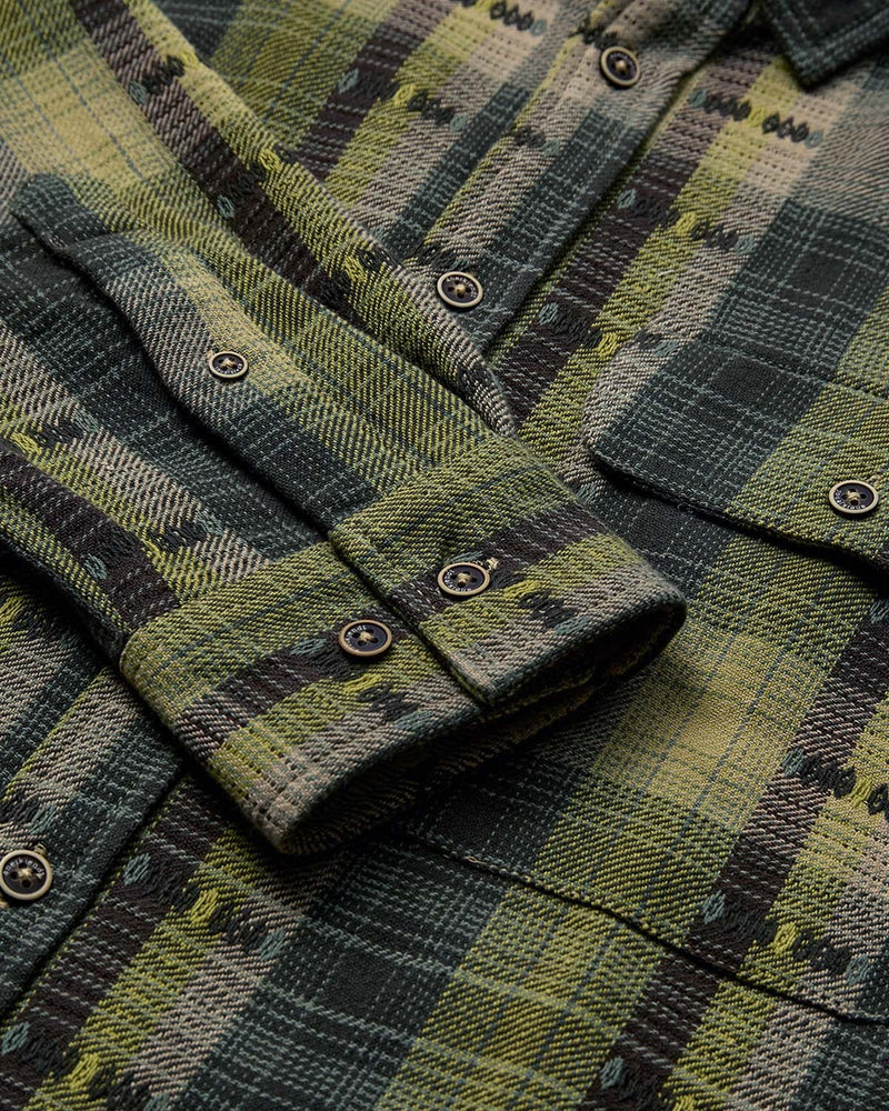 Camisa de cuadros verde con textura artesanal. Una prenda que evoca autenticidad y estilo contemporáneo.