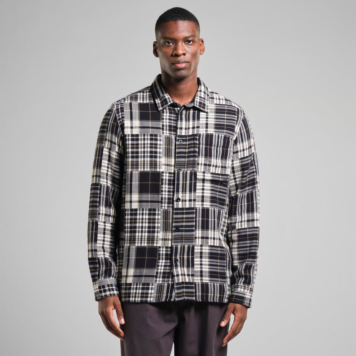 Camisa patchwork de manga larga confeccionada en algodón 100% orgánico orgánico con un estampado geométrico en tonos marrones, grises y negros.