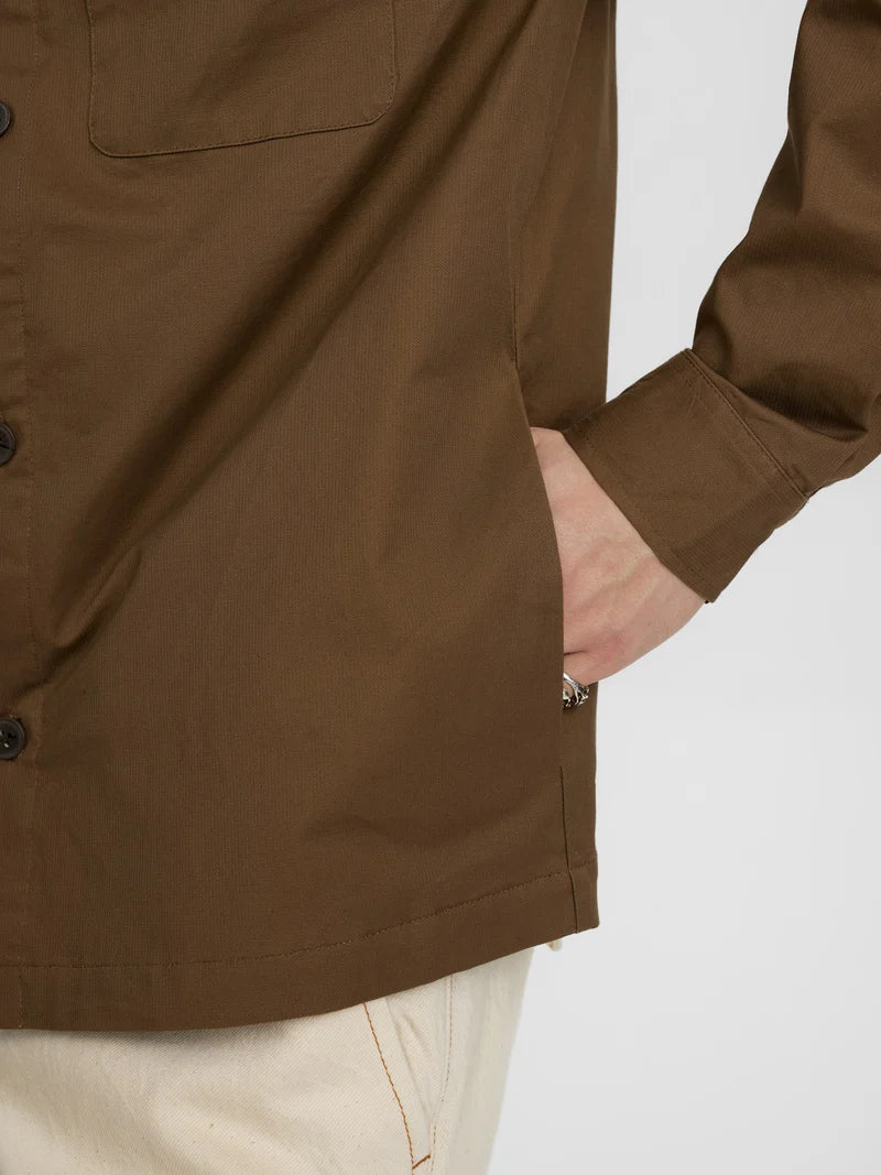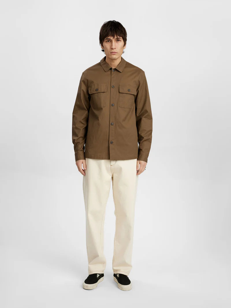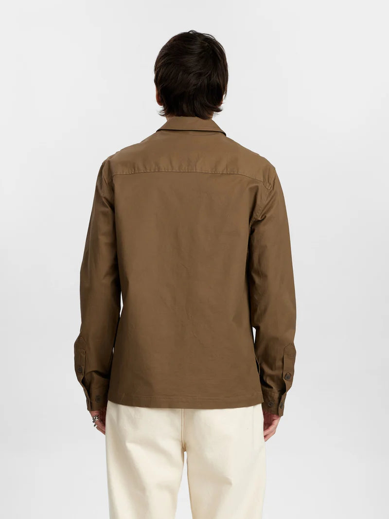 Un diseño que combina estructura y versatilidad. Esta sobrecamisa marrón tabaco se inspira en los clásicos de trabajo reinterpretados con una mirada contemporánea: líneas puras, botones tono sobre tono y un fit equilibrado que permite llevarla tanto sola como sobre prendas ligeras.