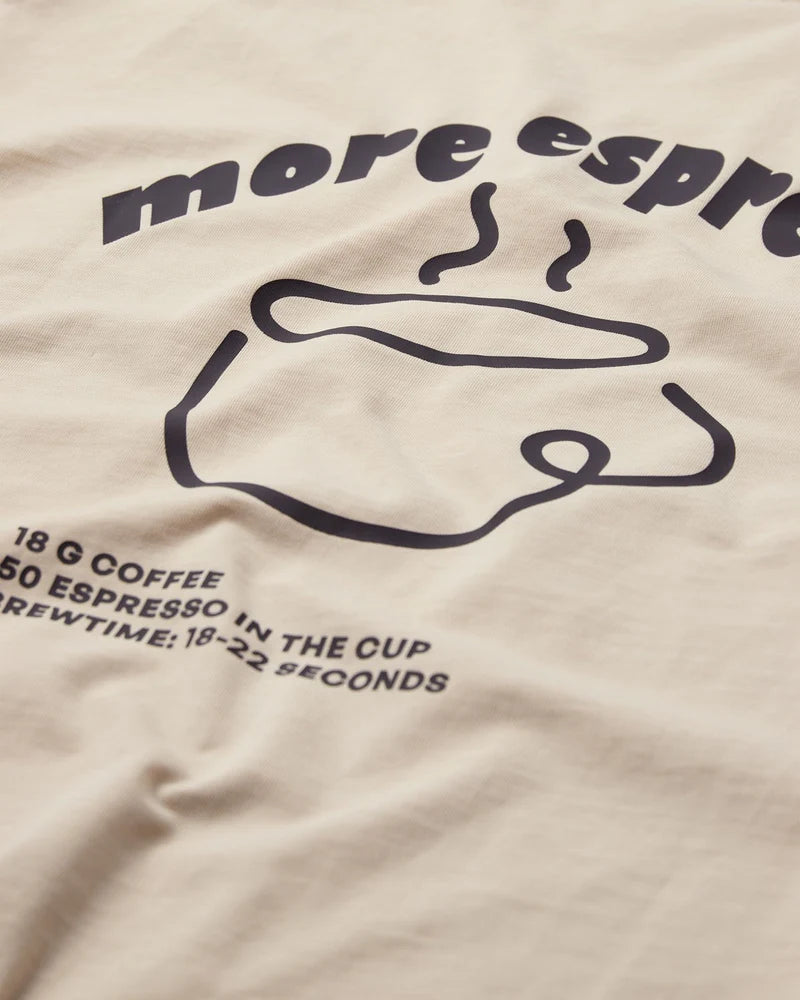 El detalle gráfico de la taza en trazo minimalista, acompañado por la inscripción “more espresso” en la espalda, aporta un guiño moderno y expresivo que eleva una prenda esencial a un objeto de estilo.
