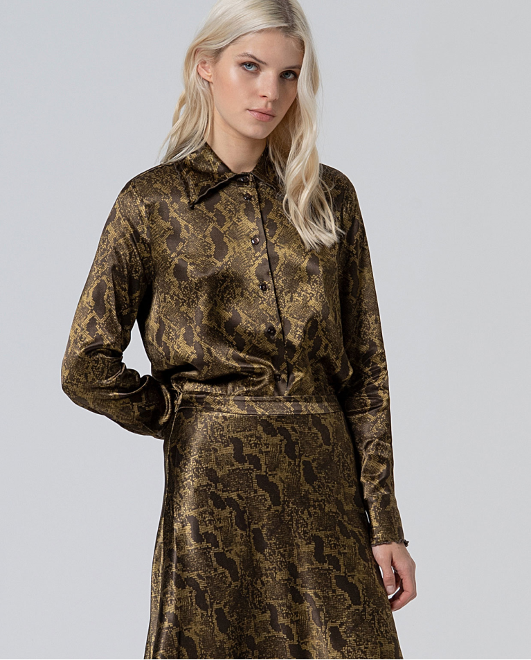 Confeccionada en un tejido satinado que capta la luz de manera delicada, su estampado de inspiración reptil aporta un toque moderno y audaz, ideal tanto para un look de día refinado como para una propuesta nocturna con actitud.