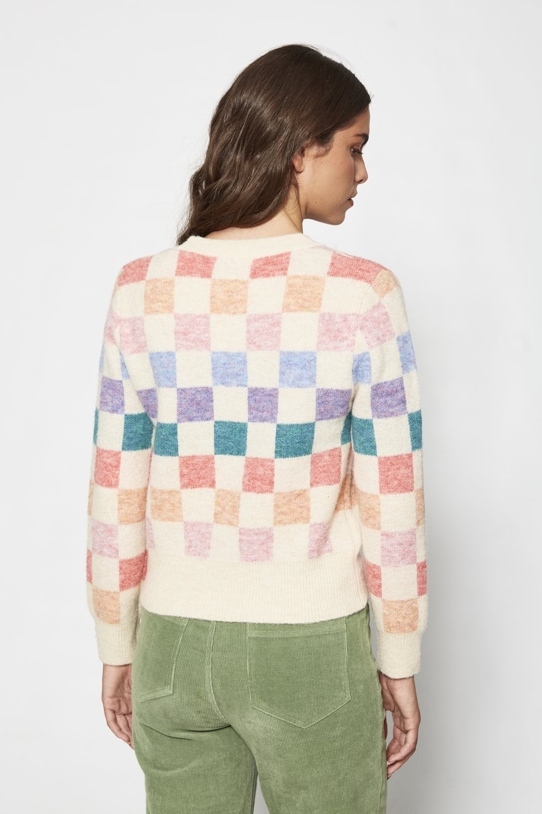 Este jersey de cuadros multicolor combina calidez y estilo con una estética alegre y refinada, perfecta para añadir un toque de color a los días más fríos.