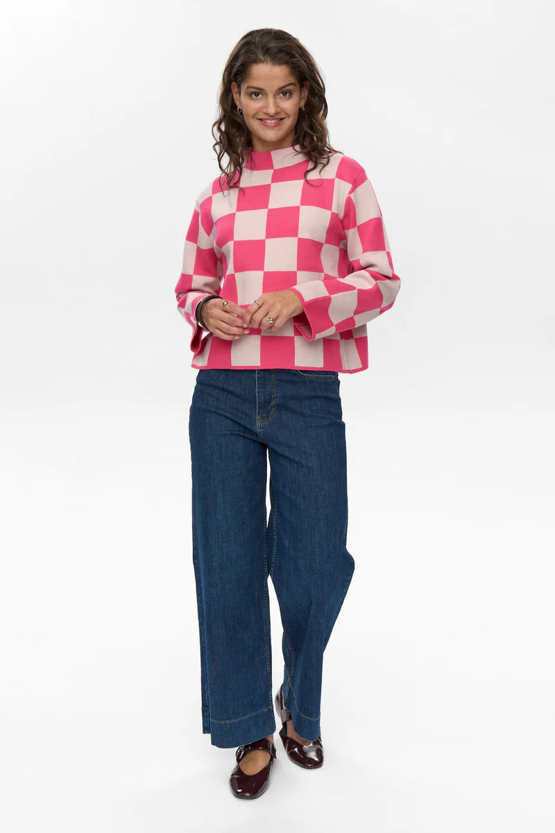 Este jersey combina la calidez del punto con un diseño gráfico atrevido, donde el estampado de cuadros en fucsia y rosa se convierte en el protagonista absoluto.