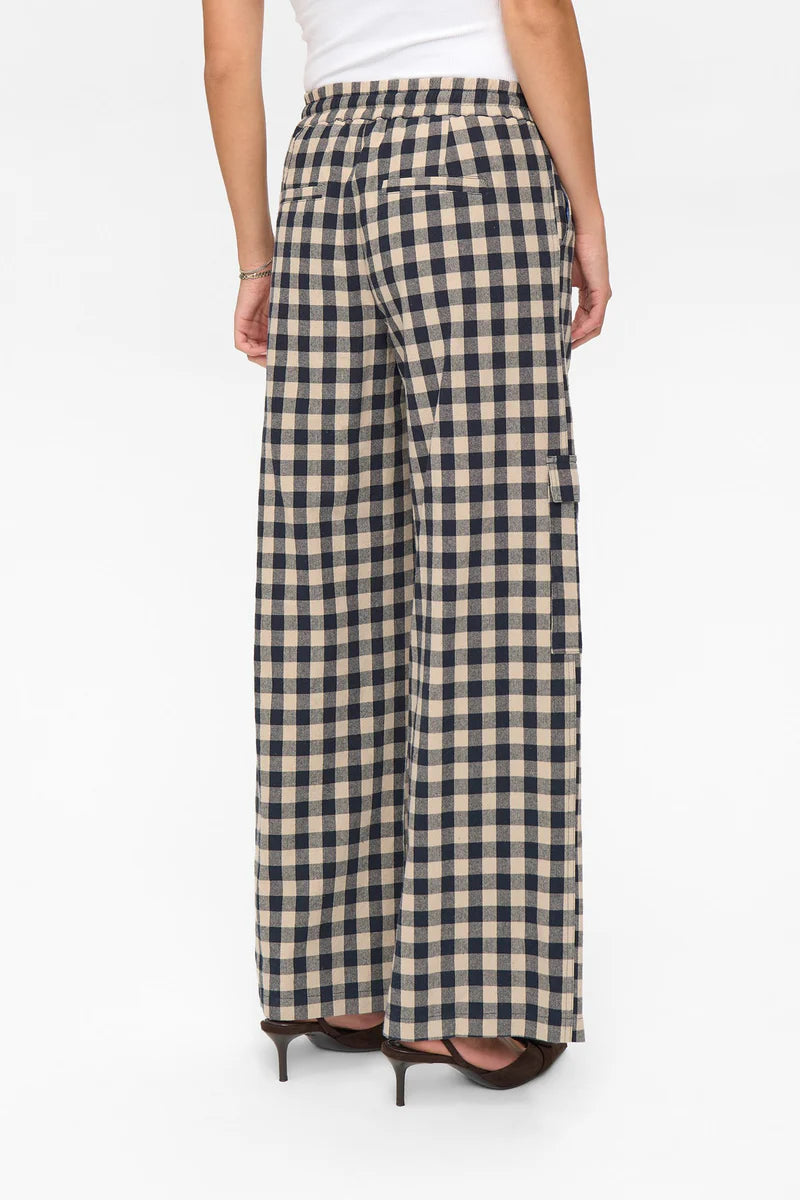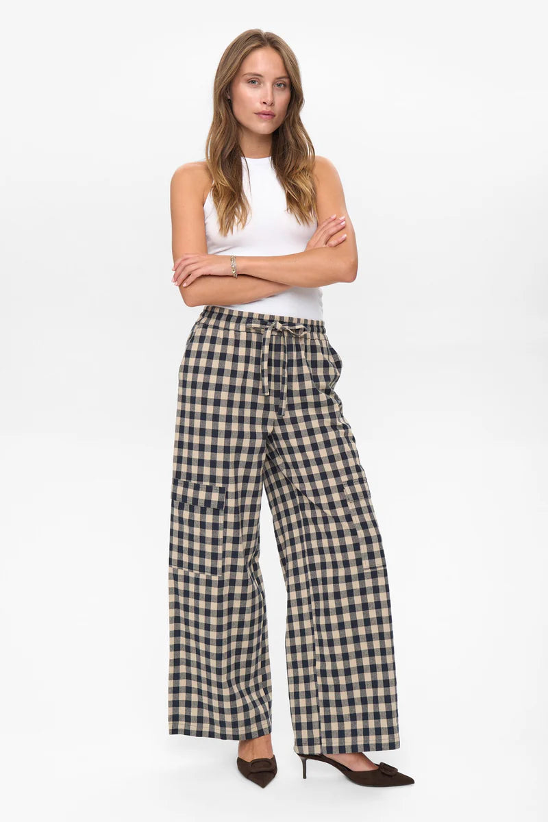 Su estampado de cuadros vichy en tonos neutros equilibra lo clásico con lo contemporáneo, logrando una prenda versátil y con carácter.
