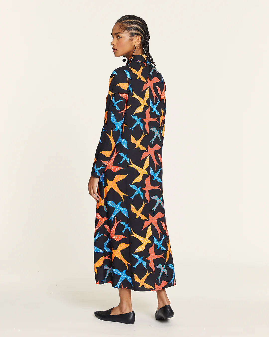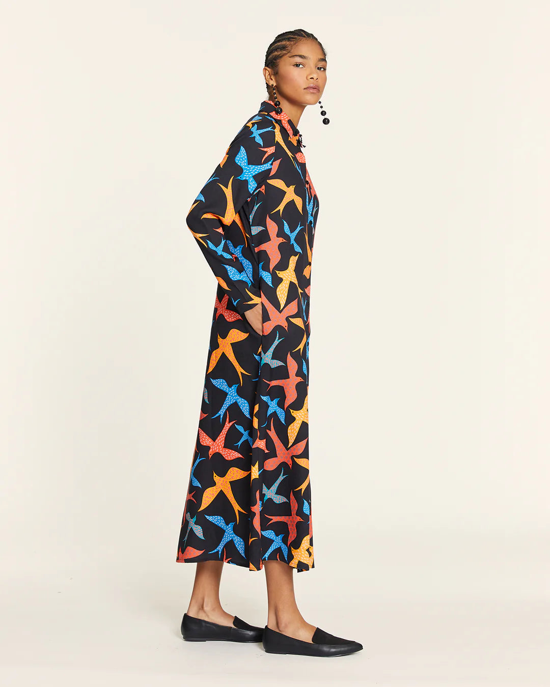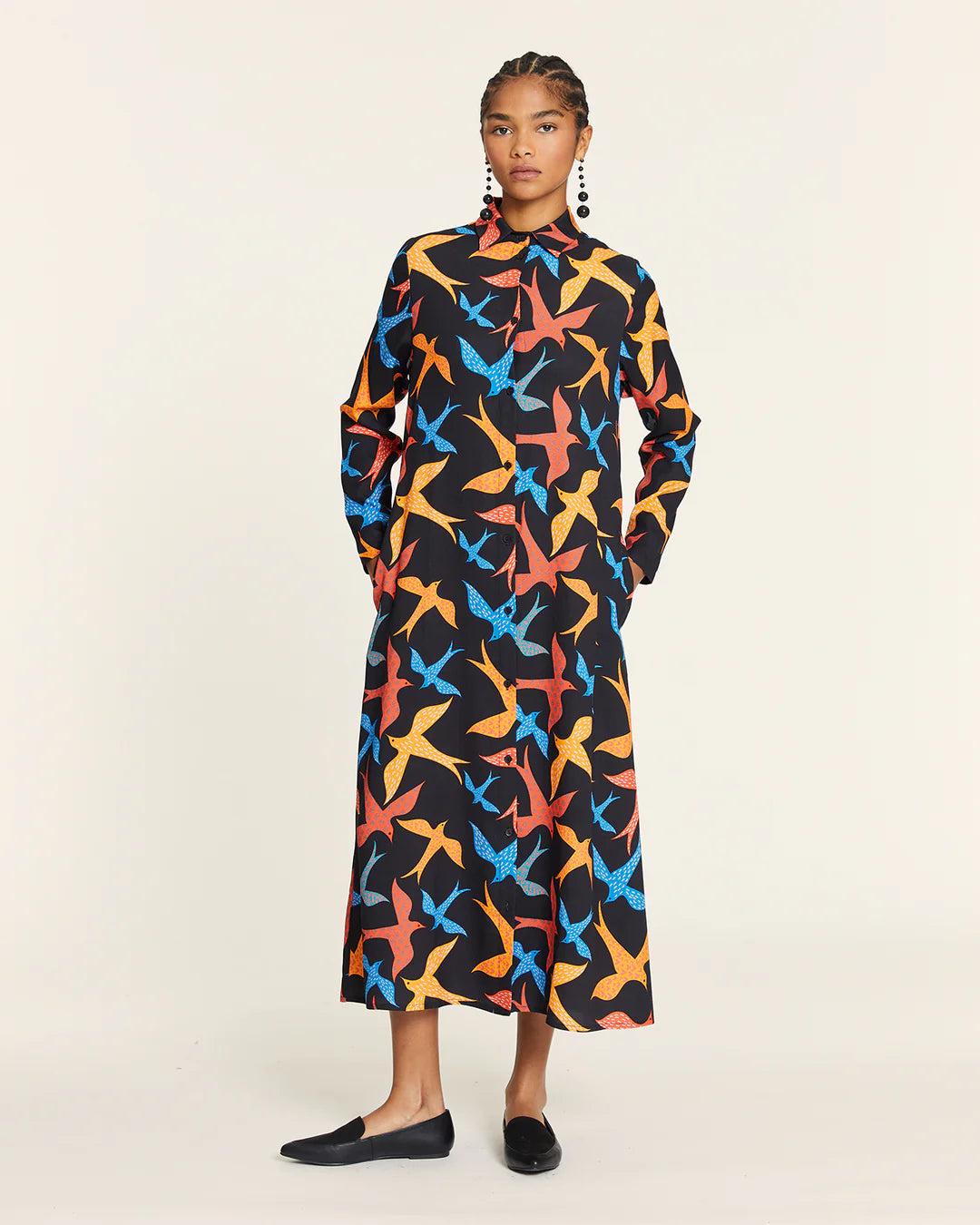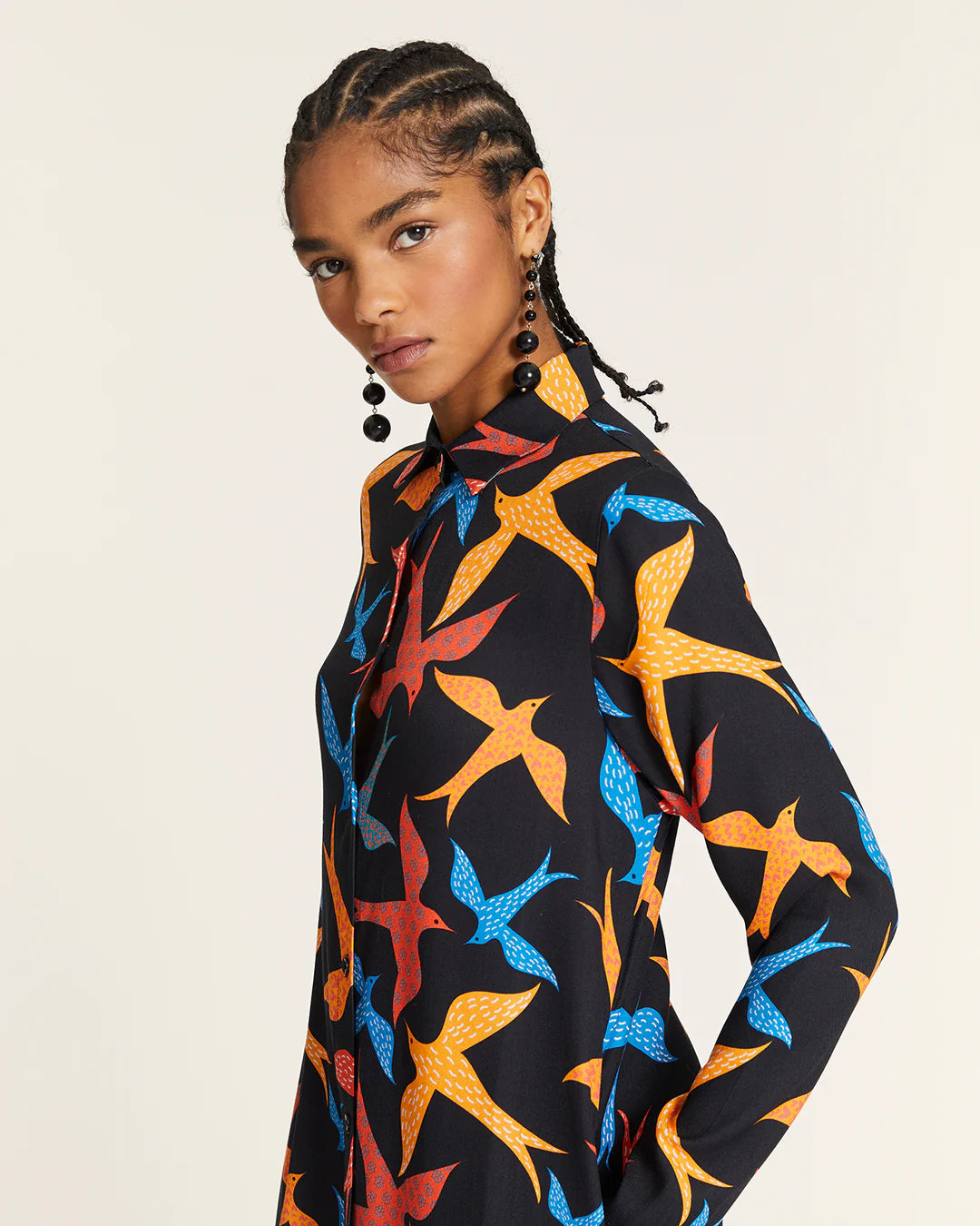 Una pieza que respira movimiento y libertad. El vestido estampado pájaros, eleva el concepto de vestido camiseros con una silueta fluida y un estampado vibrante que celebra la energía y la creatividad.