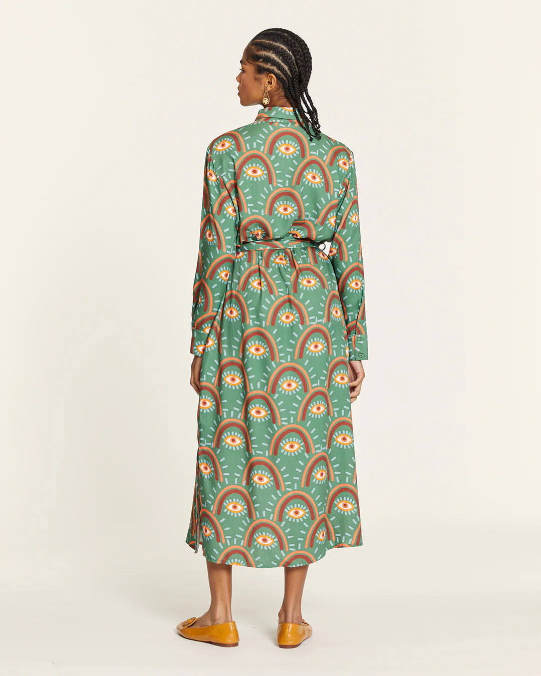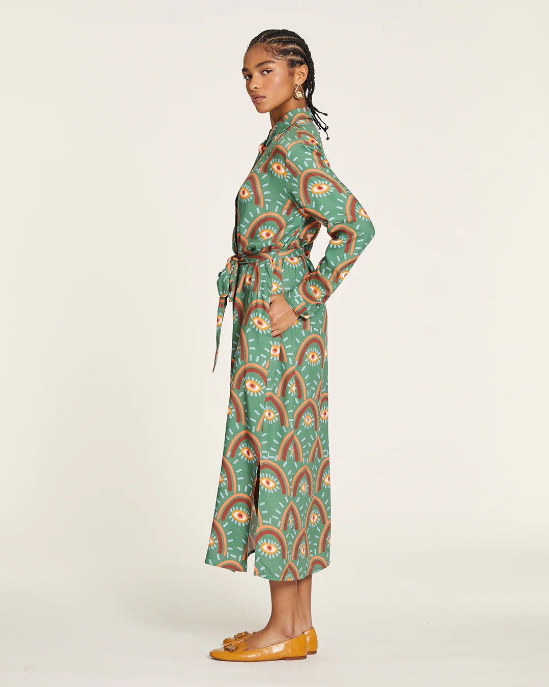 Una prenda que equilibra arte y elegancia contemporánea. Este vestido camisero largo presenta un estampado original de inspiración gráfica que combina tonos verdes con detalles en naranja y blanco, logrando una estética moderna y distintiva.