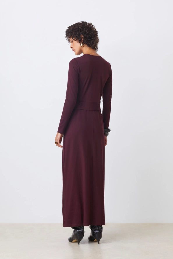Vestido largo de manga larga confeccionado en un tejido fluido con caída natural.
