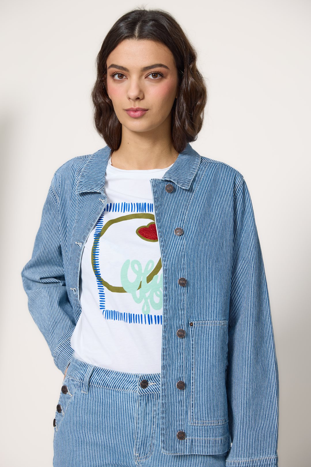 Chaqueta de tejido ligero con cuello camisero y cierre frontal de botones. Bolsillos delanteros y costuras marcadas que aportan estructura. Corte recto y estilo casual. Color azul