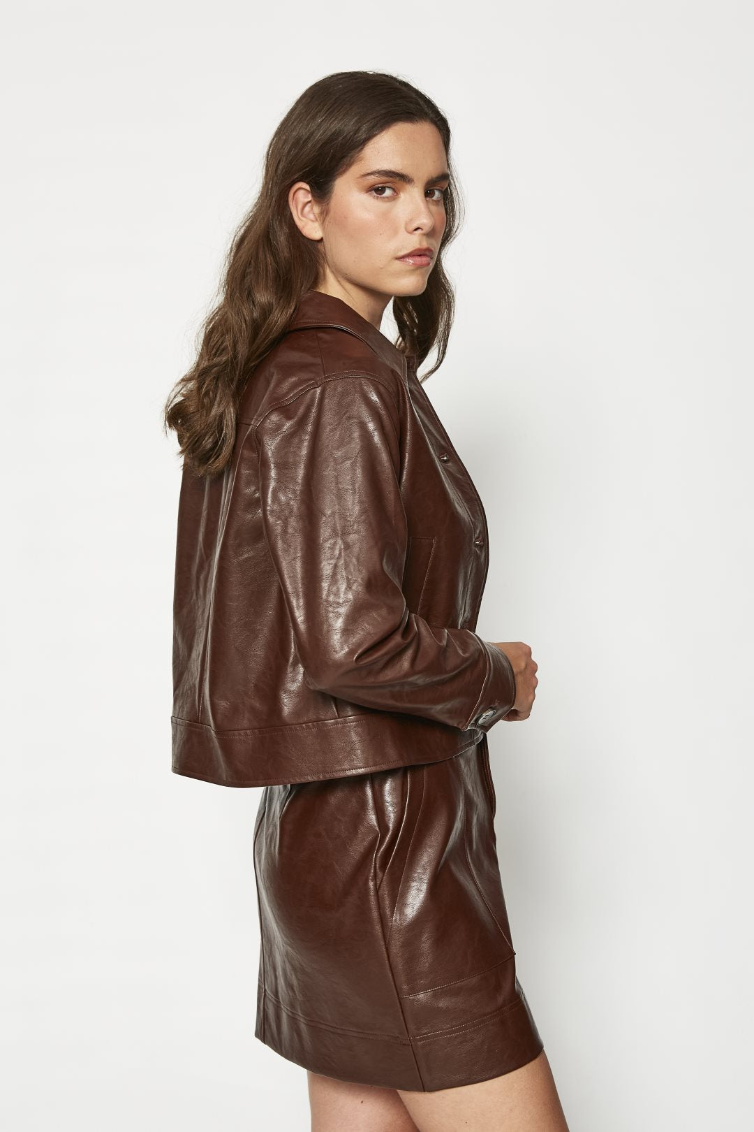 La fuerza del estilo clásico se renueva con carácter contemporáneo. Esta chaqueta efecto piel en tono burdeos evoca una elegancia sobria y urbana, reinterpretando el espíritu retro con líneas depuradas y una textura que transmite autenticidad.